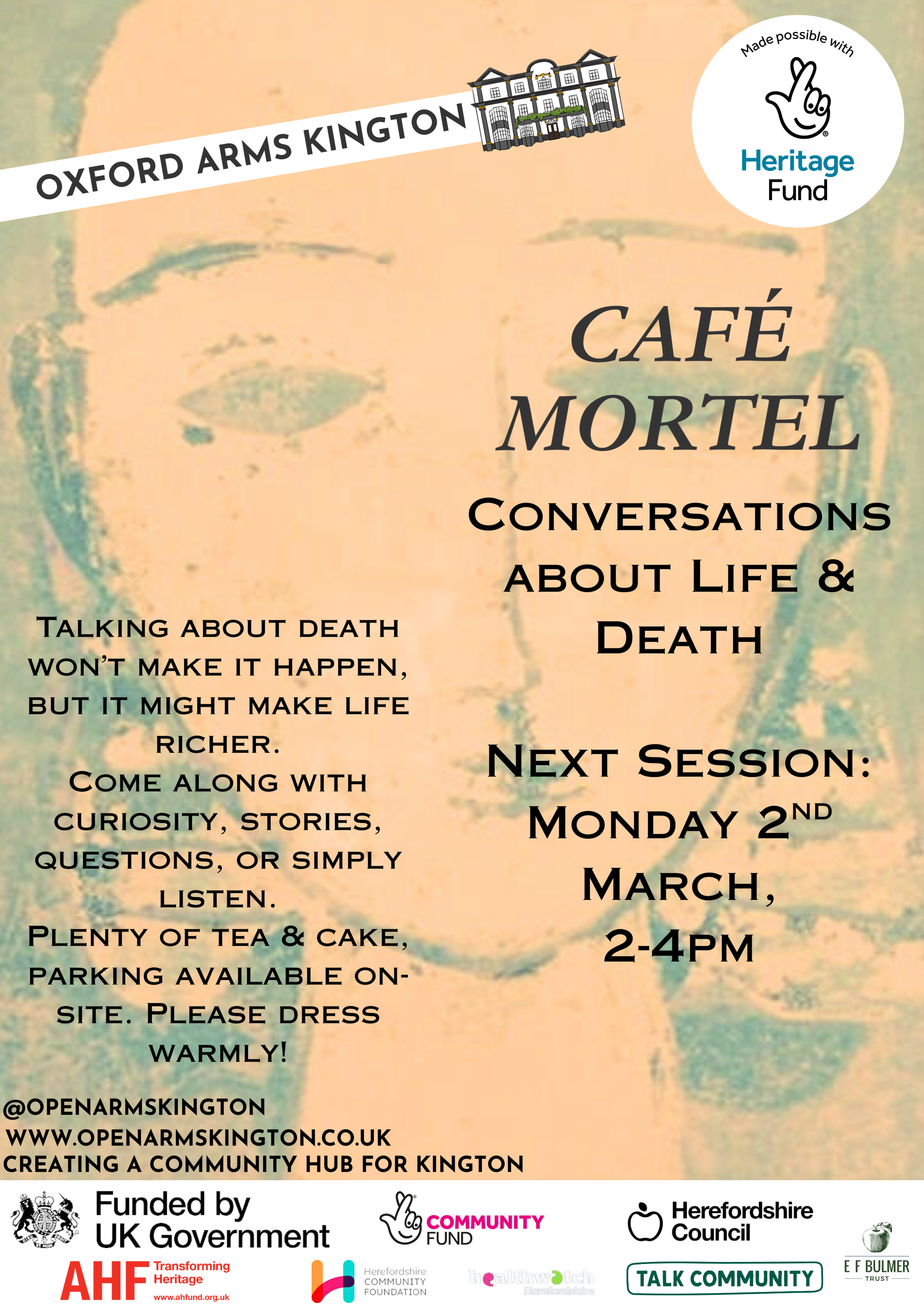 Café Mortel is a “death café”—an opportunity to talk about life, death, and everything in between in a friendly and supportive environment. We’ll be joined by death doula Carrie, there’s free parking on-site at The Oxford, and tea and cake are provided.