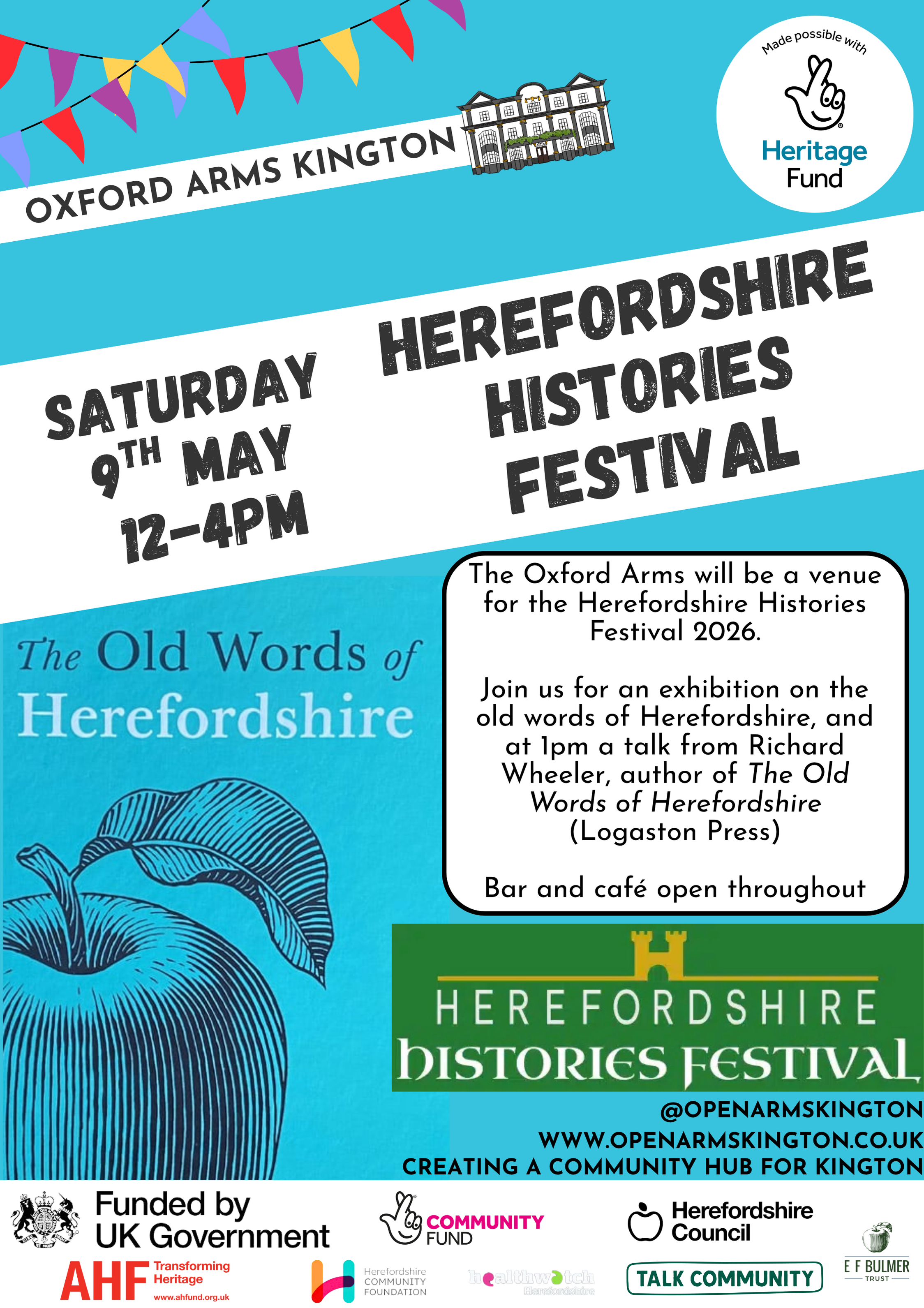 Back to All Events Herefordshire Histories Festival: old words of Herefordshire Saturday 9 May 2026 12:00 16:00 The Oxford Arms Duke Street Kington, England, HR5 United Kingdom (map) Google Calendar ICS The Oxford Arms will be a venue for the 2026 Herefordshire Histories Festival. We’ll have an exhibition on the old words of Herefordshire, and Richard Wheeler—author of The Old Words of Herefordshire (Logaston Press)—will be giving a talk at 1pm.Bar and café open throughout, free entry.