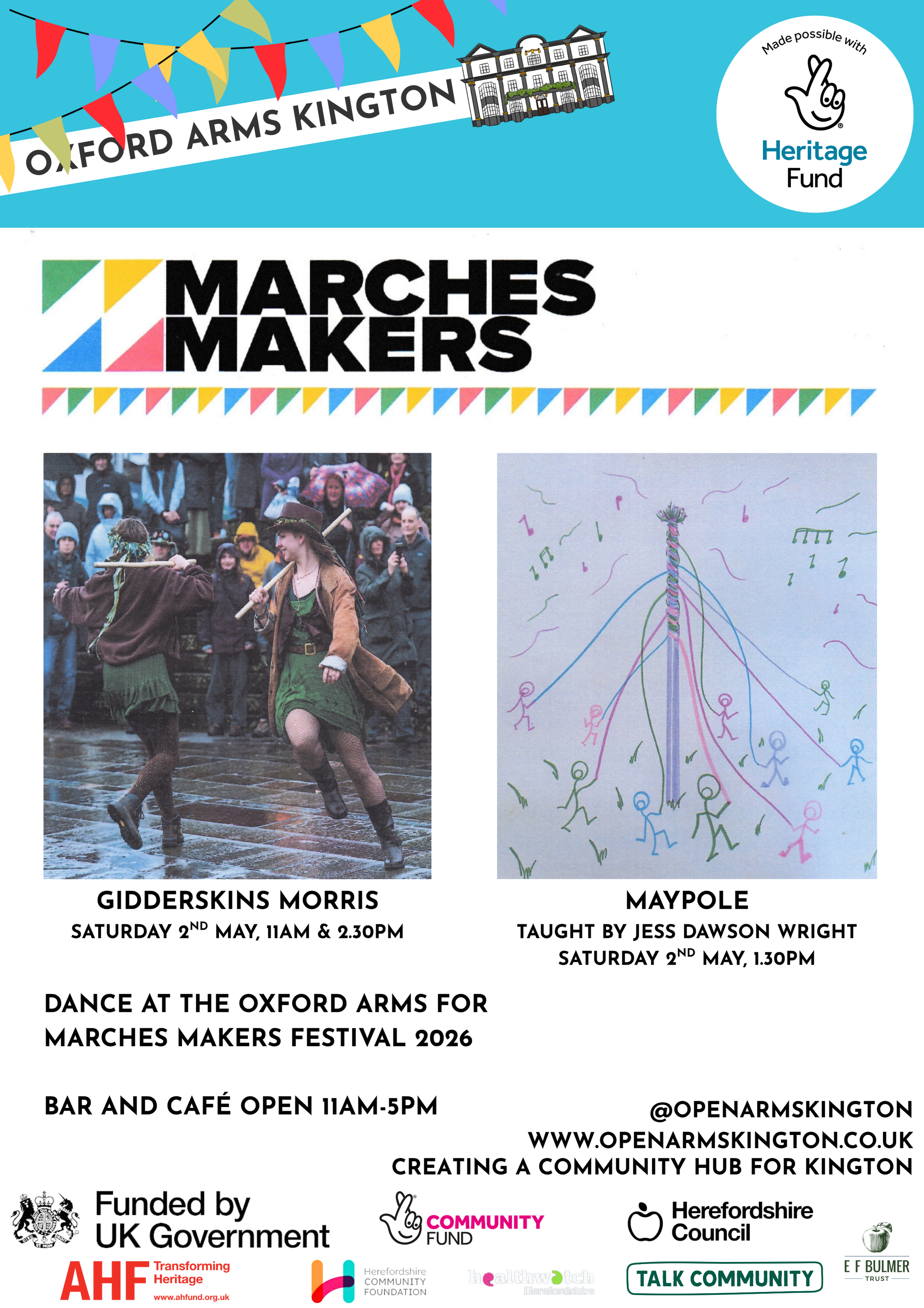 As well as our exhibition on the forgotten words of Herefordshire, we’ll be celebrating the 2026 Marches Makers festival at The Oxford with morris and maypole dancing! Gidderskins Morris will perform at 11am and 2.30pm, sandwiching participatory maypole dancing taught by Jess Dawson Wright. Bar and café open 11am-5pm.